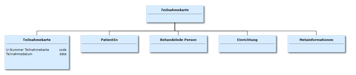 Die folgende Abbildung enthält keine Kardinalitäten, sprich keine Angaben, ob und wie häufig ein bestimmtes Element vorliegen kann bzw. muss. Diese Angaben sind abhängig vom Szenario und können folgendem Bereich entnommen werden: Anwendungsszenario-Teilnahmekarte.