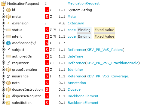 Übergabe der Daten einer Verordnung Die im FHIR®-Profil abgebildete Information findet sich im Informationsmodell unter 11.1.14.1 Rezeptierdaten/Verordnung, 2. Rezeptierdaten/Verordnung, 2.1 Allgemeine Rezeptierdaten, 2.1.1 Referenz Krankenversicherung, 2.1.11 Noctu, 2.1.13 BVG, 2.1.2 Referenz behandelnde Person / Einrichtung, 2.1.3 Referenz PatientIn, 2.1.4 Rezepttyp, 2.1.5 Gruppierung, 2.1.6 Unfallinformationen, 2.1.6.1 Unfallkennzeichen, 2.1.6.2 Unfalltag, 2.1.6.3 Name des Unfallbetriebs, 2.1.7 Zuzahlungsstatus, 2.1.8 Kennzeichen Rechtsgrundlage, 2.1.9 Ausstellungsdatum, 2.2 Verordnungsinhalt, 2.2.10 Anzahl der verordneten Packungen, 2.2.13.6 Gebrauchsanweisung, 2.2.2 Sonderkennzeichen BtM-Rezept, 2.2.3 T-Rezept-Ankreuzfelder, 2.2.3.1 Off-Label, 2.2.3.2 In-Label, 2.2.3.3 Informationsmaterial, 2.2.3.4 Sicherheitsbestimmungen, 2.2.4 Aut idem, 2.2.7 Abgabehinweis, 2.2.8 Dosierung, 2.2.8.1 Kennzeichen und 2.2.8.2 Dosieranweisung.