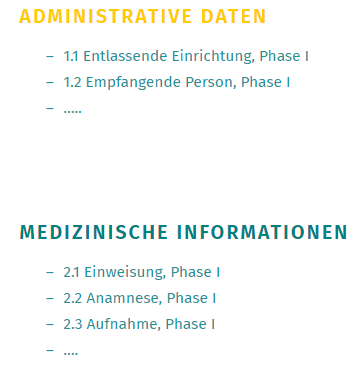 Dabei bildet die Gruppe "Administrative Daten" die entsprechenden administrativen und organisatorischen Daten des Patienten sowie der entlassenden Einrichtung ab und die Gruppe "Medizinische Informationen" alle relevanten Informationen zum Krankenhausaufenthalt.