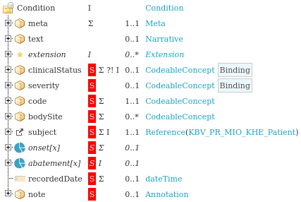 Dieses Profil bildet eine Diagnose ab. Die im FHIR®-Profil abgebildete Information findet sich im Informationsmodell unter 2.1.3.1 Diagnose, 2.2.2.1 Diagnose, 2.3.3.1 Diagnose, 2.4.1 Diagnose, 3.2.1 Diagnose, 3.2.1.1 Code/Bezeichnung, 3.2.1.2 Klinischer Status, 3.2.1.3 Schweregrad, 3.2.1.4 Körperstelle, 3.2.1.5 Klinisch relevanter Zeitraum, 3.2.1.6 Feststellungsdatum, 3.2.1.7 Dokumentationsdatum und 3.2.1.8 Freitextbeschreibung.