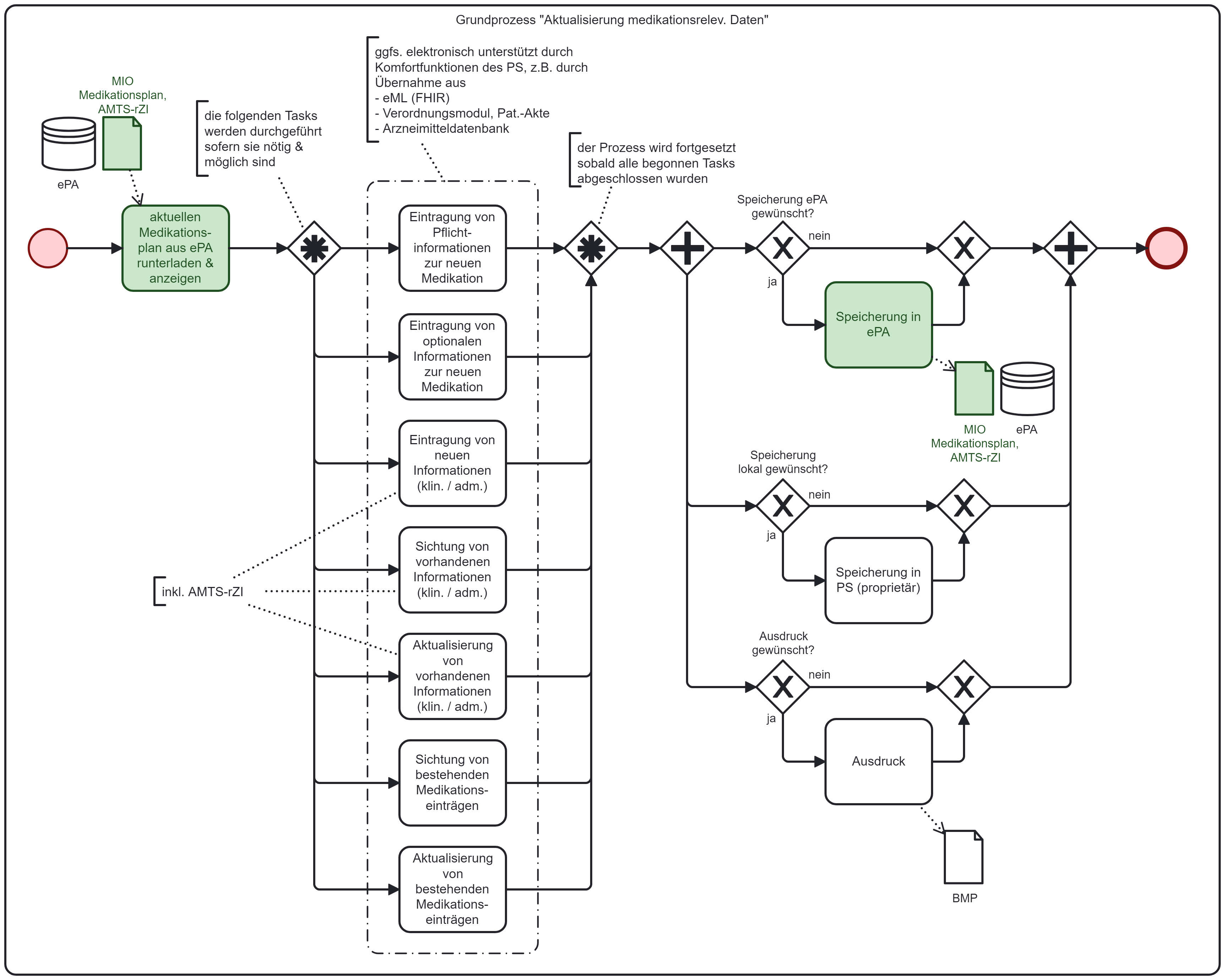 Kommt es zu einer Änderung oder Neuerhebung/-erstellung medikationsrelevanter Daten (zum Beispiel Verordnungen, AMTS-relevante Zusatzinformationen (AMTS-rZI) und / oder andere klinische bzw. administrative Daten), werden diese in der Regel in der Primärdokumentation (Primärsystem) festgehalten. Zusätzlich kann es sinnvoll bzw. notwendig sein, diese Daten auch im Medikationsplan (ePA) zu dokumentieren. In diesem Falle muss zunächst der aktuelle Medikationsplan (ggfs. inklusive AMTS-rZI) aus der ePA heruntergeladen und angezeigt werden (technische Voraussetzung).