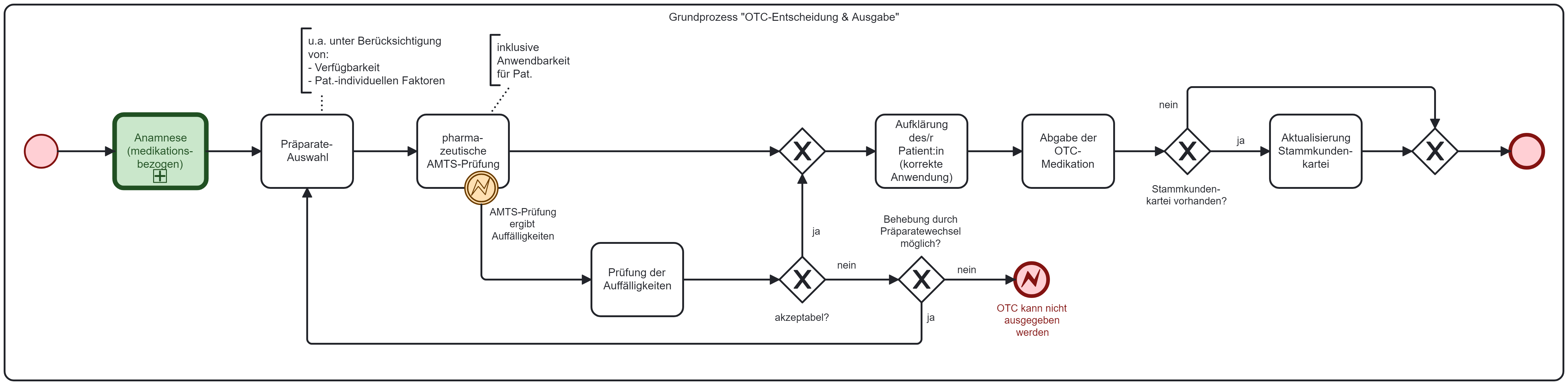 Neben der Rezept-Einlösung kann auch ein Beratungsanliegen Grund zur Patientenvorstellung in der Apotheke sein. Aus der Beratung heraus kann sich eine Empfehlung für eine OTC-Medikation (OTC: over the counter, nicht rezeptpflichtige Medikation) ergeben. Alternativ kann auch der primäre Wunsch zum Kauf einer OTC-Medikation die Patient:innenvorstellung auslösen. In beiden Fällen muss zunächst eine medikationsbezogene Anamnese stattfinden. Im Anschluss kommt es unter Berücksichtigung u. a. der Verfügbarkeit und der erhobenen patient:innenindividuellen Faktoren zur Präparate-Auswahl und zu einer pharmazeutischen AMTS-Prüfung. Ergeben sich hierbei Auffälligkeiten, werden diese auf Akzeptabilität geprüft. Sind die Auffälligkeiten nicht akzeptabel, muss geprüft werden ob ein Präparatewechsel möglich ist und die Auffälligkeiten beheben würde. Wenn ja, wird ein neues Präparate ausgewählt, wenn nein, kann keine OTC-Medikation ausgegeben werden. In diesem Falle muss bei anhaltendem Bedarf ggfs. eine ärztliche Konsultation erfolgen.