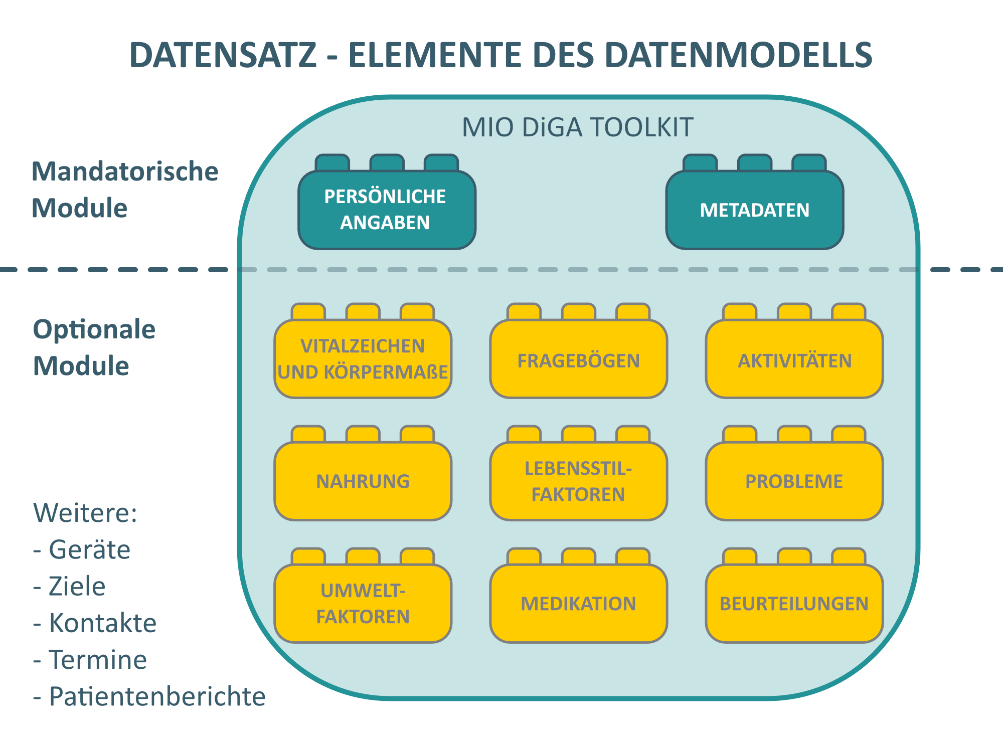 Da nicht jede DiGA jedes medizinische Modul für ihren speziellen Anwendungsfall benötigt, werden die Module als optionale Bausteine im Datenmodell definiert. Dadurch wird ermöglicht, dass eine DiGA ausschließlich die für sich relevanten Elemente aus dem Toolkit implementieren muss. Die Meta-Informationen hingegen sind für jede DiGA obligatorisch umzusetzen.