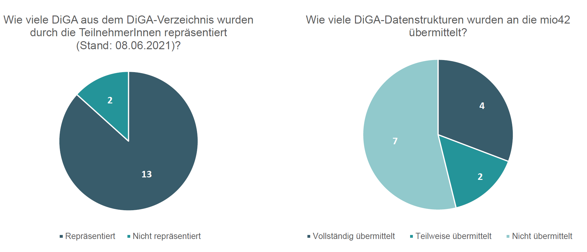 Am Workshop haben 10 von 12 eingeladenen DiGA-HerstellerInnen teilgenommen. Insgesamt wurden von sechs TeilnehmerInnen DiGA-Datensätze an die mio42 übermittelt: