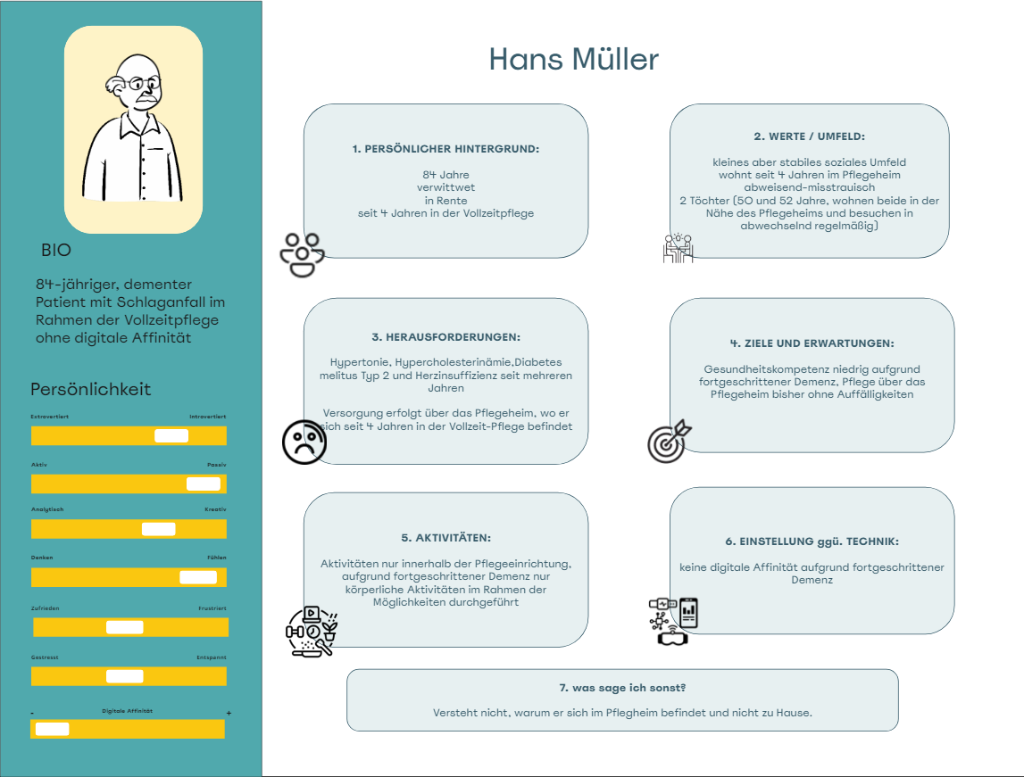 Der 84-jährige Patient Herr Müller wird aufgrund Immobilität, Multimorbidität und Demenz seit dem Jahr 2020 dauerhaft in einer stationären Pflegeeinrichtung (Pflegeheim) versorgt. Dort erfolgt die Betreuung im Rahmen eines Heimversorgungsvertrages über einen Heim-Hausarzt sowie über eine Partnerapotheke mit Blisterzentrum. Am Morgen des 05.05.2024 wird bei dem Patienten in der Pflegeeinrichtung einen Schlaganfall mit eindeutiger Symptomatik (Aphasie, Armparese rechts) festgestellt, welcher am Vorabend noch nicht bestand. Die Pflegeeinrichtung alarmiert daraufhin den Rettungsdienst, der den Patienten notfallmäßig in die nahe gelegene Stroke Unit zur Aufnahme und weiteren Therapie einweist.
