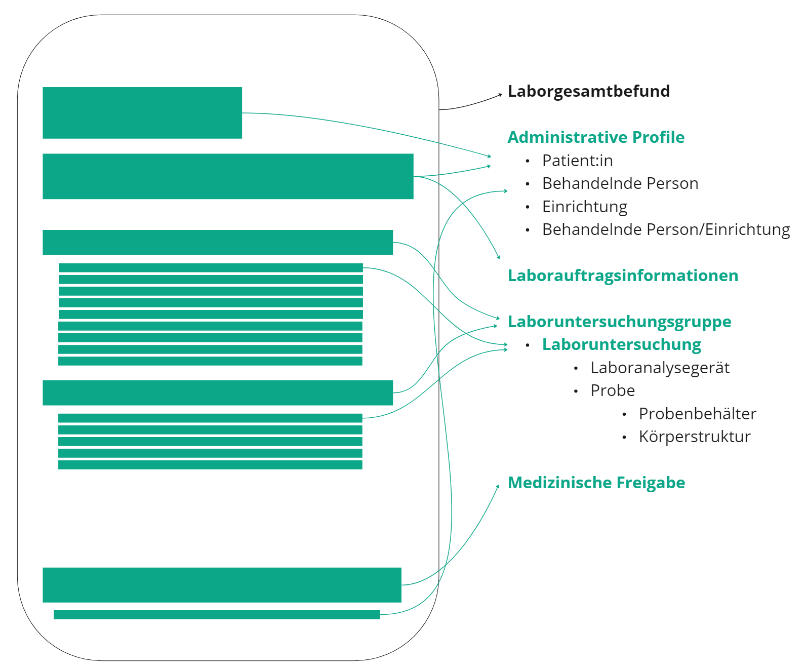 Die unten stehende Abbildung 3 zeigt beispielhaft aus welchen "Referenzierten Profilen" des Informationsmodells die Übertragung das schematisch-dargestellte Druckformat eines Laborbefundes befüllt wird.