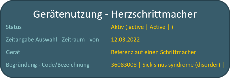 Beispiel für Gerätenutzung eines Herzschrittmacher: Zeitangabe Auswahl - Zeitraum - von=12.03.2022 (das Implantationsdatum des Schrittmachers), von=leer (Schrittmacher wurde bislang nicht explantiert) Status: Aktiv Gerät - Referenz auf den Schrittmacher Begründung - Code/Bezeichnung: 36083008 | Sick sinus syndrome (disorder) |