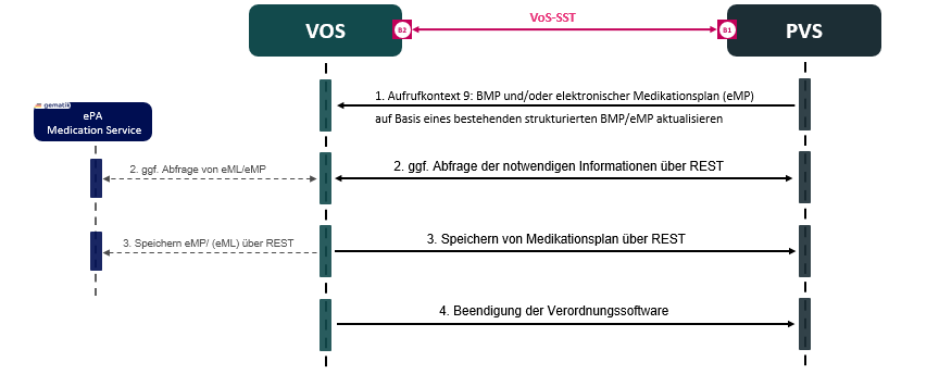 Die Behandelnde Person kann die VoS mit dem Aufrufkontext = 9 aus dem PVS aufrufen. Diese Anforderung ermöglicht den direkten Aufruf der Verordnungsfunktion „Medikationsplan auf Basis eines bestehenden strukturierten MPs aktualisieren/ansehen“ mit den dazugehörigen Daten. Beispiel: Ein MP aktualisieren/ansehen, welcher als strukturiertes Dokument in der Patientendokumentation vorliegt.