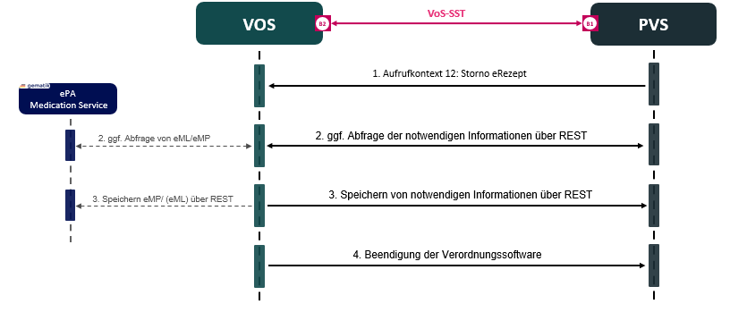 Die Behandelnde Person kann die VoS mit dem Aufrufkontext = 12 aus dem PVS aufrufen. Diese Anforderung ermöglicht den direkten Aufruf der Verordnungsfunktion „eRezept-Storno“ mit den dazugehörigen Daten. Beispiel: Stornierung des eRezeptes.