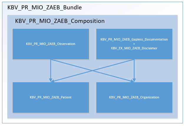 Die Composition KBV_PR_MIO_ZAEB_Composition gibt die Struktur des Dokumentes vor. Die Inhalte bestehen aus Verweisen auf andere Ressourcen. Da ein Dokument im juristischen Sinne vollständig und unveränderlich sein muss, wird die Composition mit allen referenzierten Ressourcen zu einem Bundle zusammengefasst (KBV_PR_MIO_ZAEB_Bundle).