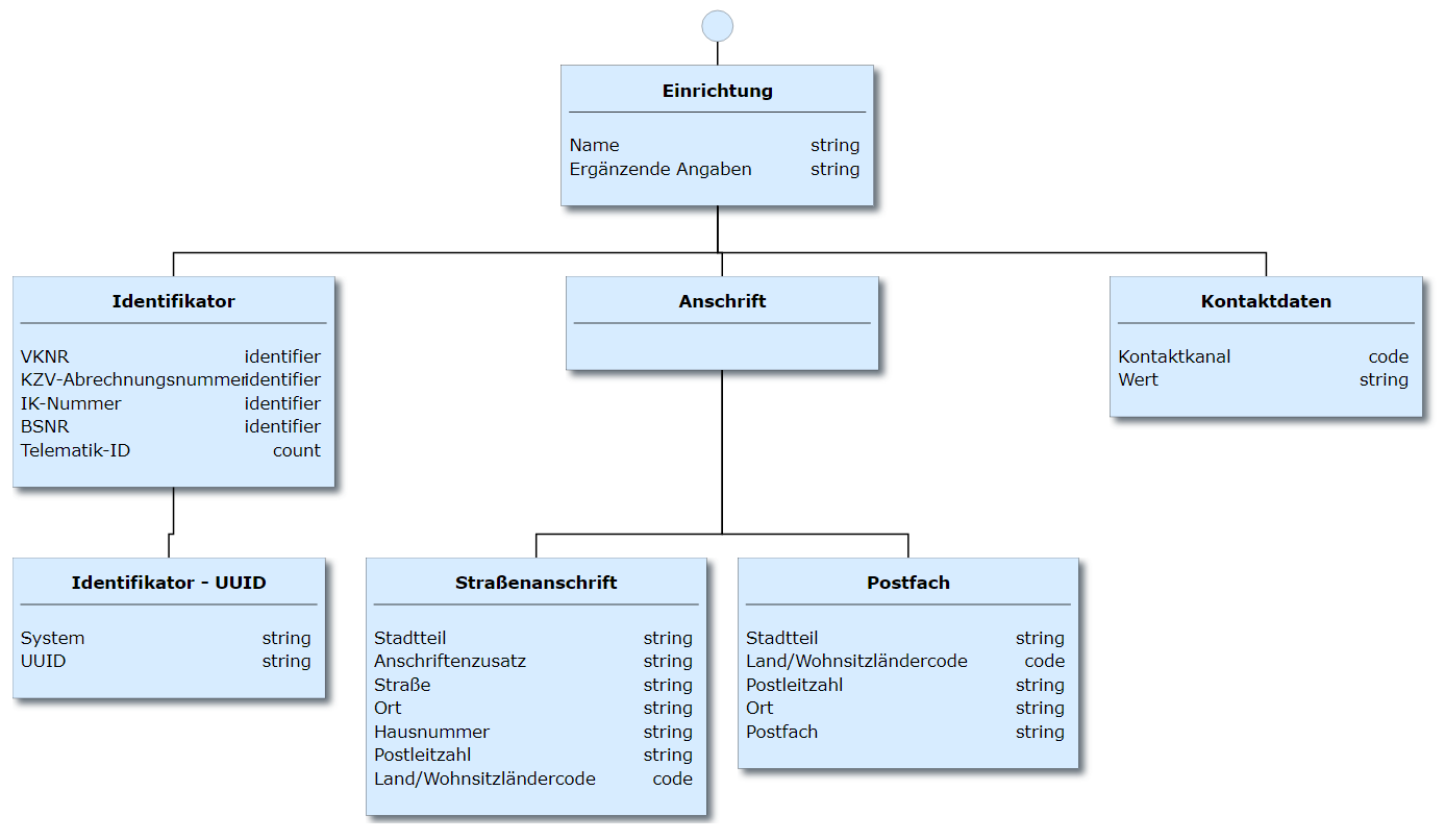 Die Einrichtung beschreibt beispielsweise den Ort,an dem ein Kontakt zwischen der zu behandelnden Person und der leistungserbringenden Person stattfindet (z. B. Praxis). Diese kann aber auch eine rein "fiktive" Organisation zur Abrechnung sein (z. B. IK-Organisation für Hebammen).