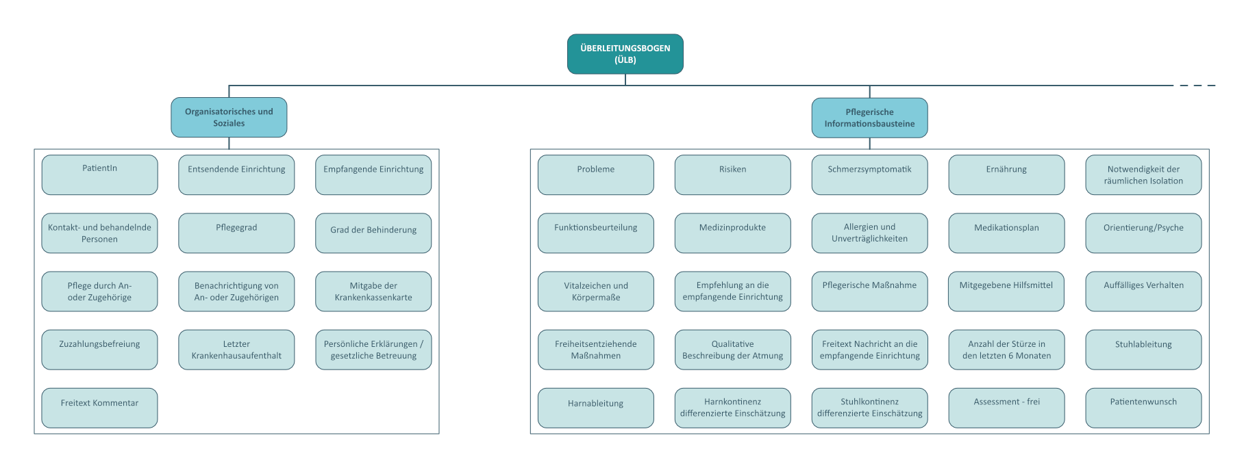 Der Datensatz "Überleitungsbogen" besteht aus Datenelementen, die mit dem Pflegebeirat abgestimmt wurden und die für eine Überleitung relevanten pflegerischen und zum Teil auch medizinischen Informationen enthält. Dieser Datensatz ist in drei Hauptabschnitte gegliedert: