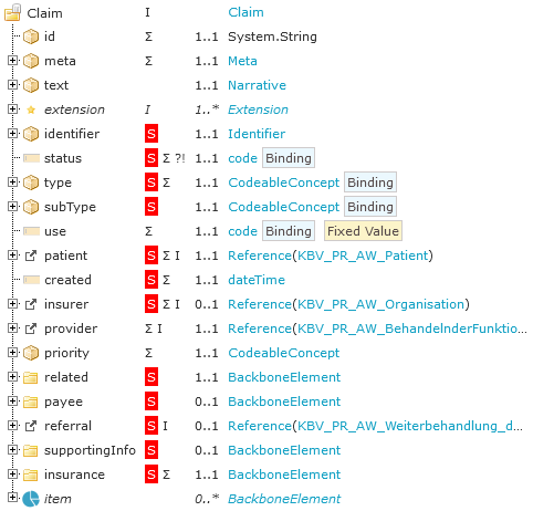 • Das Element Claim.patient.reference sollte mit einem MS versehen werden, da es eine Kardinalität von 1..1 besitzt und immer befüllt werden muss.