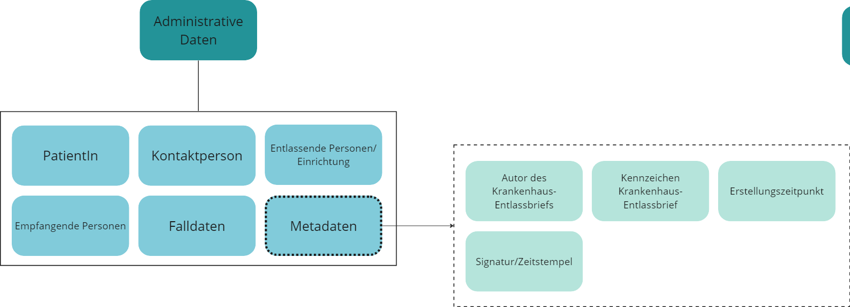 In der folgenden Abbildung 3 werden die Gruppen bzw. Elemente der Gruppe "Administrative Daten" des Informationsmodells aufgeführt. Diese Gruppe bildet u. a. Informationen zum/zur Patient:in, der entlassenden Person/Einrichtung, etc. ab.